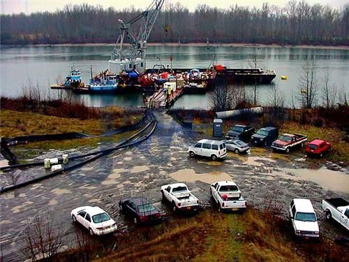 Client Request: Remove bucket dredged material which has been loaded into 1,500 cubic yard capacity (7-cell) barges. The thick dredged material must be transported 600′ to the assigned disposal area.