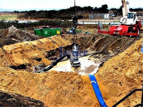 Our Solution: Utilize the DP-75 (8″) dredge system to pump the slurry created in two makeshift pits by mixing sand, brought in from off-site, with water pumped from both the ocean and the river esctuary. The resulting 10% slurry would then be pumped in the tube’s fill ports at an average of 1,200 gallons per minute using a header system that branched out into multiple lines. With the position of the two slurry pits, the slurry mix would have to be pumped 200-2,500 feet.